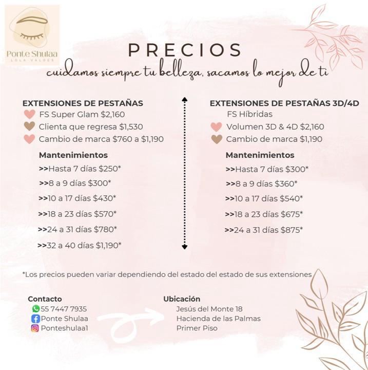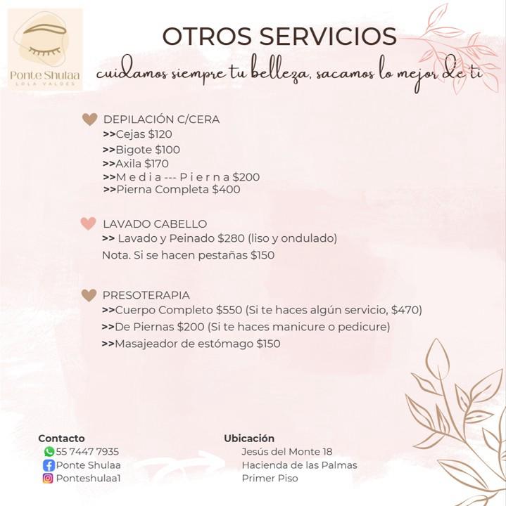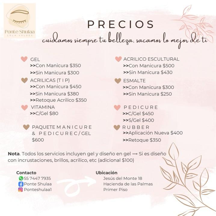 En Ponte Shulaa ofrecemos servicios profesionales de belleza pensados para mujeres que buscan cuidarse con intención, detalle y cariño. Contamos con diseño de cejas, lifting y extensiones de pestañas, manicure, pedicure, uñas de gel y acrílico, además de servicios complementarios de spa para que te relajes y reconectes contigo misma. Cada detalle está pensado para resaltar tu mejor versión, con productos de alta calidad y un equipo capacitado que entiende lo que necesitas para sentirte segura, hermosa y poderosa.